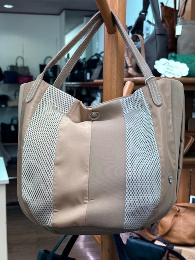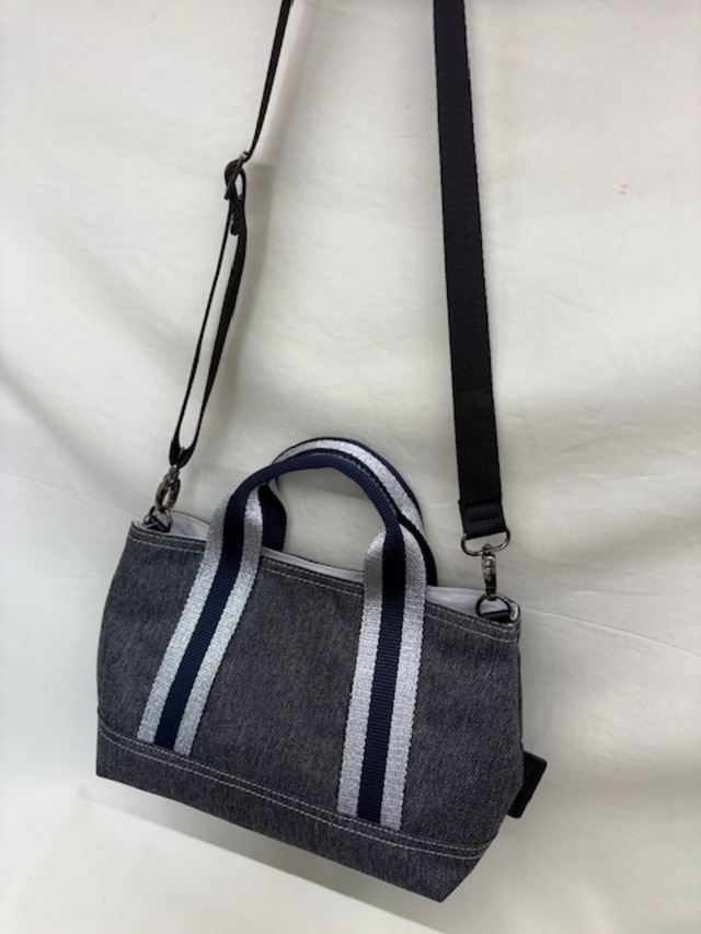 デニム風ナイロン素材に革付属 チョイ持ちしやすいサイズ感 イタリア製ラメラインIVYテープが効いている2WAYトート 本体の内装は両サイドファスナーポケット 中央に出し入れしやすいスナップ付カバー size 18✖24(29)✖11