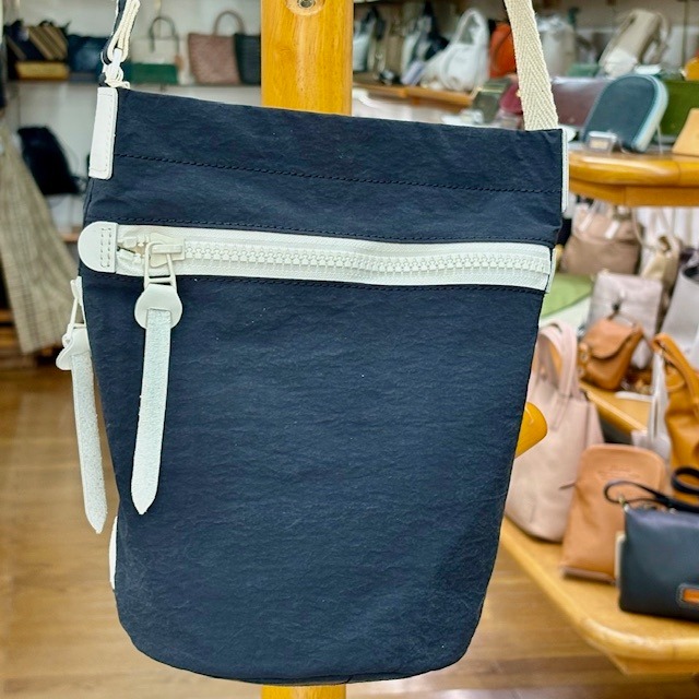 ドット柄素押しのナイロン素材を使用したショルダーバック キャメルの牛革付属の超軽量 サイドポケット、前面2個ポケ、背面は大き目ファスナーポケット 引張が丸!って使いやすい size 25✖21.5✖11 collar ネイビー・グレー 重量 250g