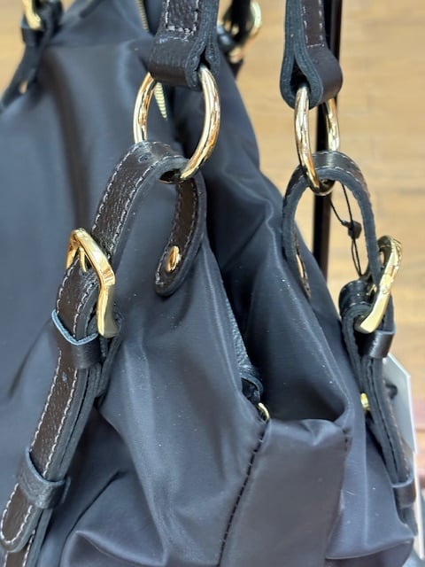 ナイロン本体に牛革付属のハンドルが女性らしい柔らかい雰囲気を醸しだいています