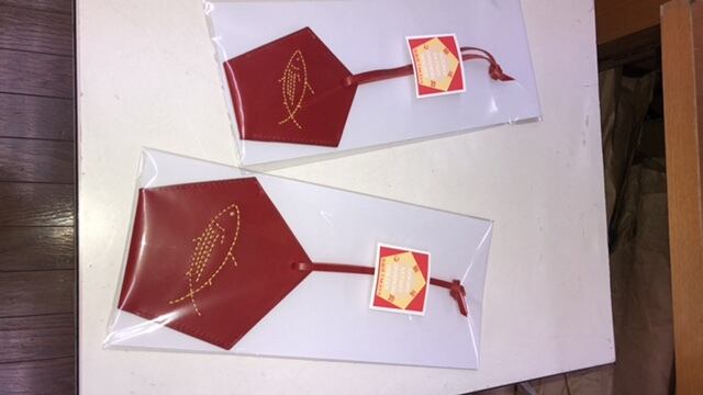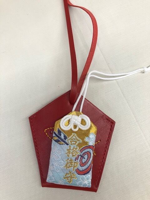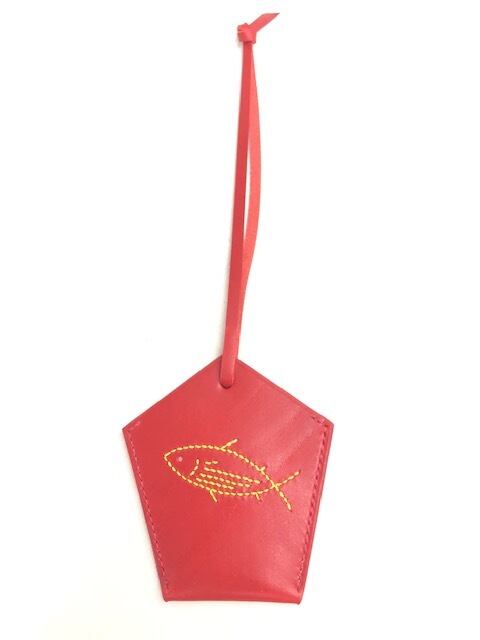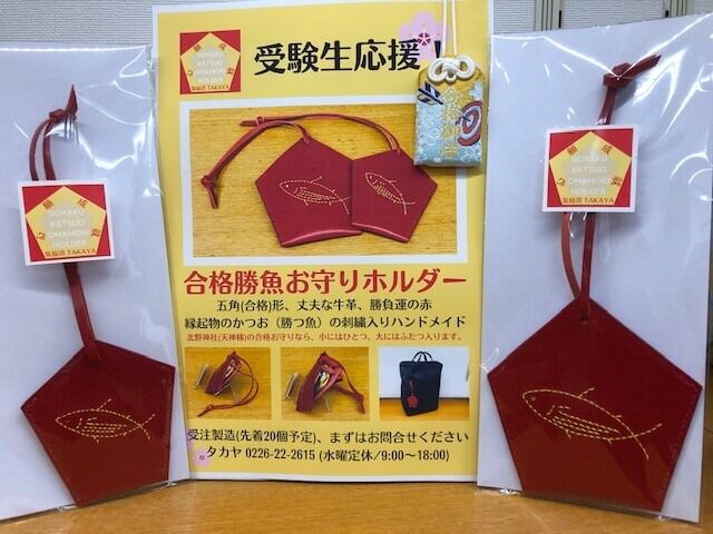 五角(合格)形・勝負運の赤・縁起物の勝つ魚(カツオ)・イタリアンレザー使用しハンドメイドで仕上げました